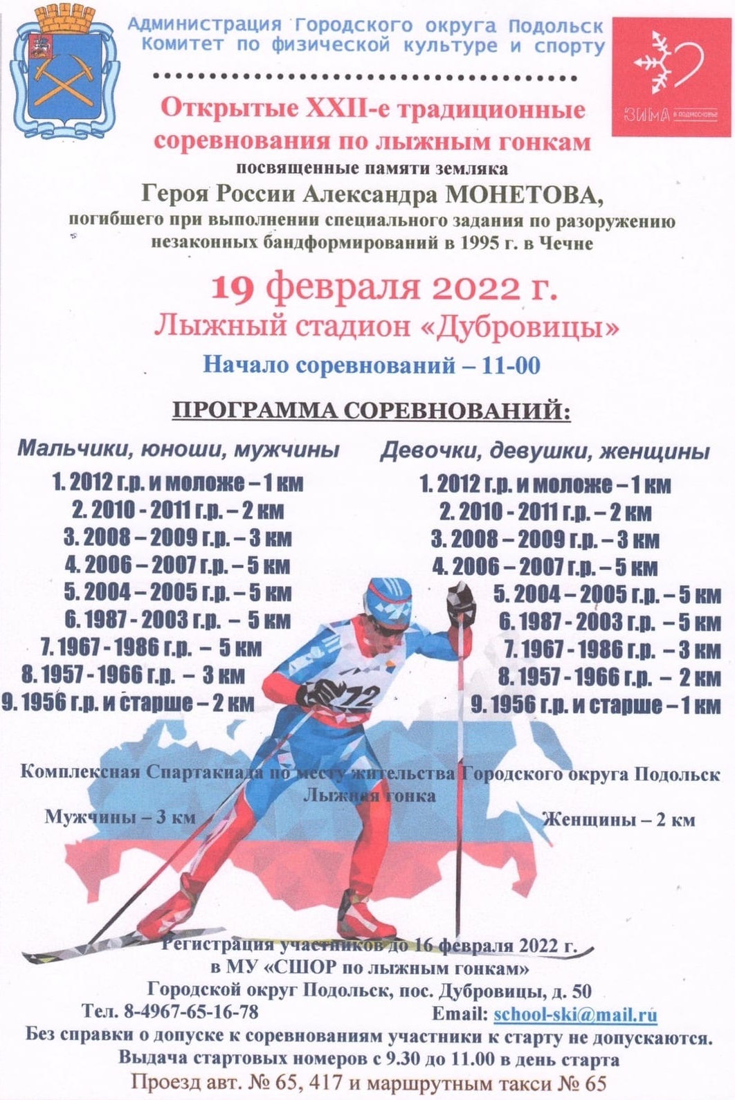Как сообщили в Комитете по физической культуре и спорту администрации Городского округа Подольск, мероприятие пройдет на лыжной трассе Спортивной школы олимпийского резерва по лыжным гонкам в парке Дубровицы. Начало в 11.00, масс-старт по группам, стиль свободный. Выдача номеров участникам 19 февраля на стартовой поляне с 09.30 до 11.00.