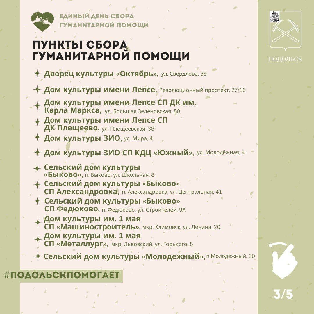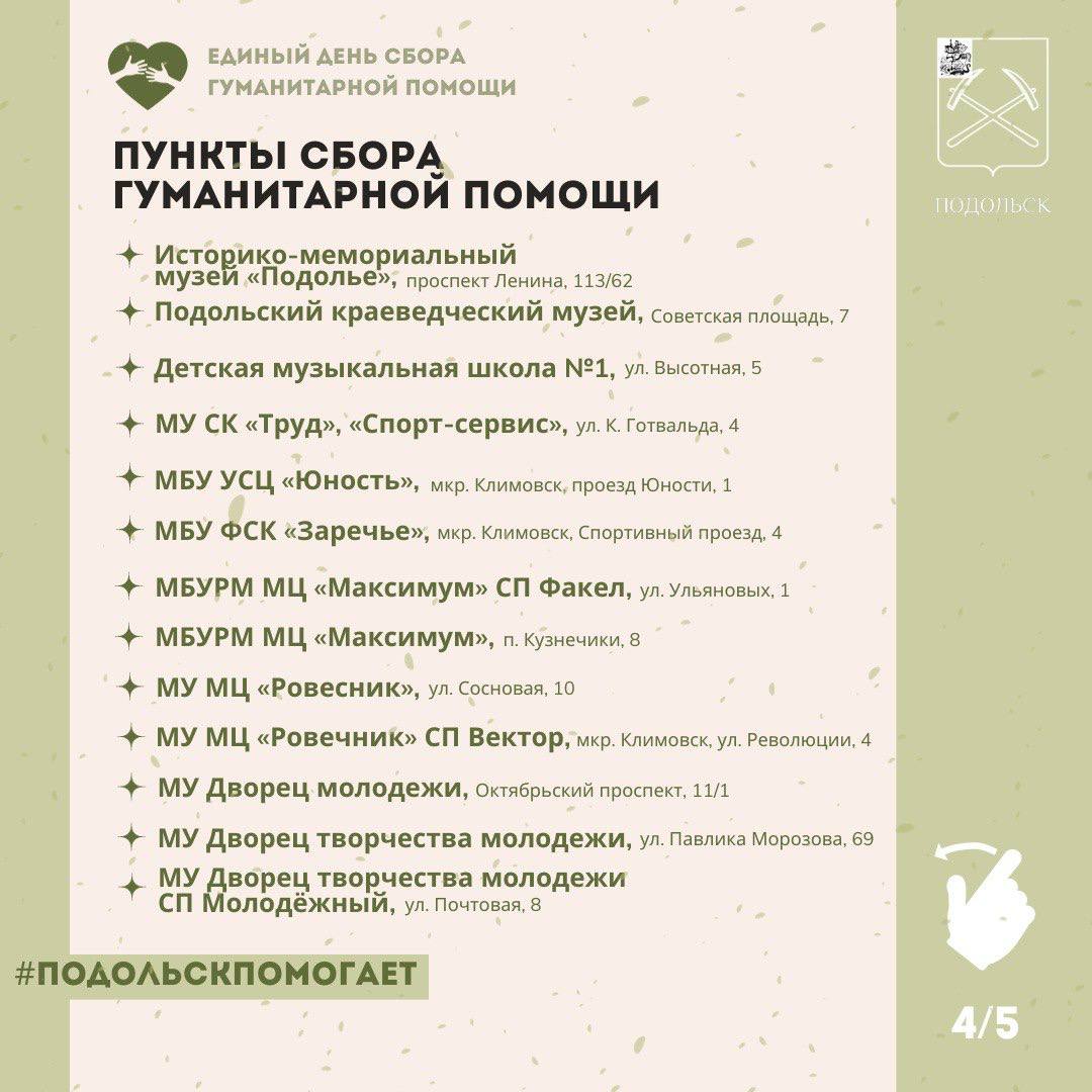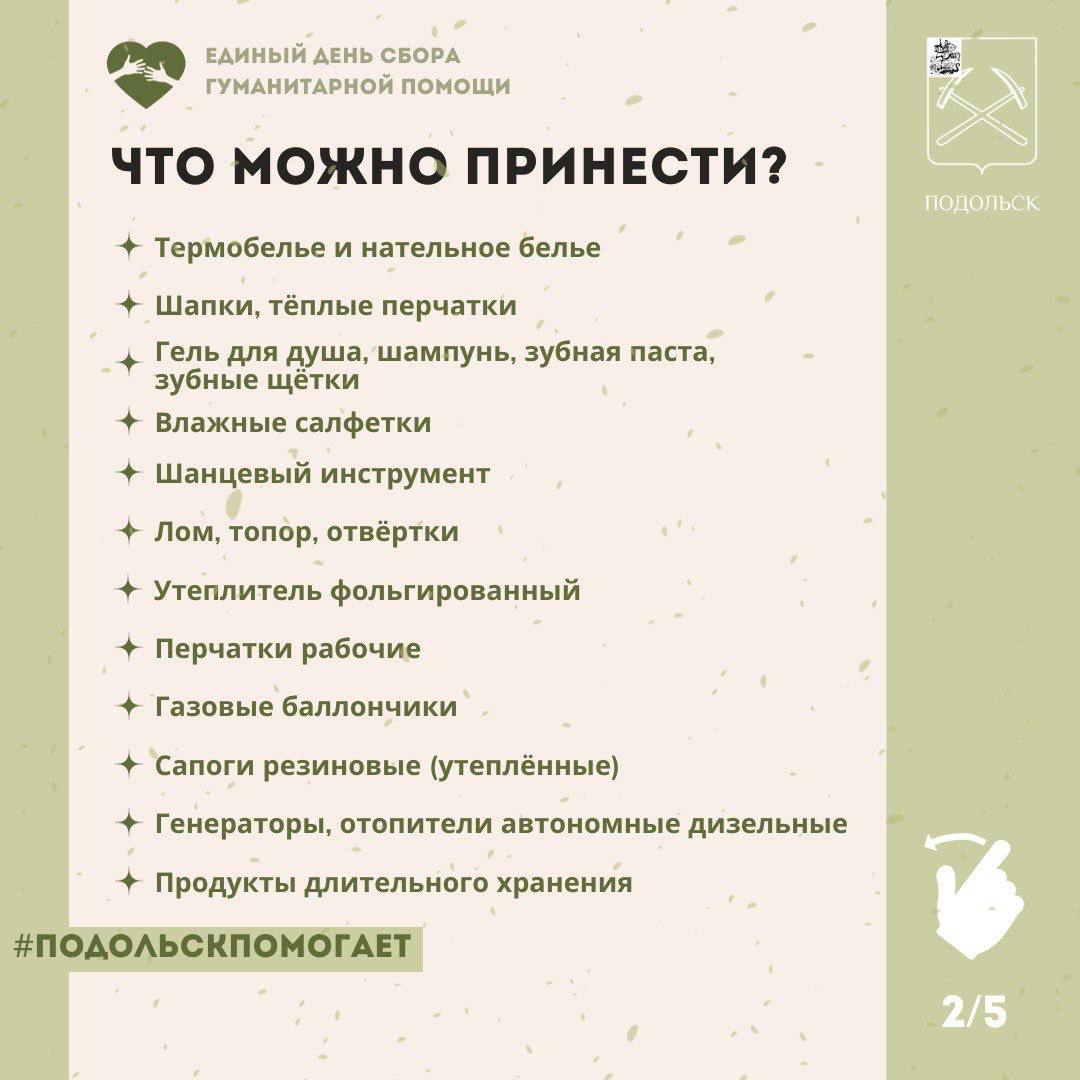 К этой дате мы приурочили очередной единый день сбора гуманитарной помощи. В рамках акции «Подольск помогает» уже с раннего утра начнут свою работу более 20 пунктов, куда можно принести необходимые вещи для военнослужащих.