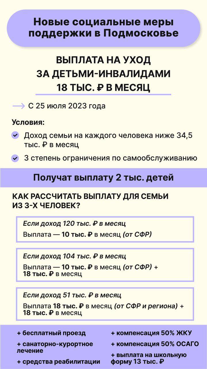 Вводится новая выплата для семей с детьми-инвалидами, у которых III степень ограничения по самообслуживанию — 18 тыс. рублей. Родителям необходимо подать заявление на региональном портале «Госуслуги». Заявления принимаются с 25 июля.