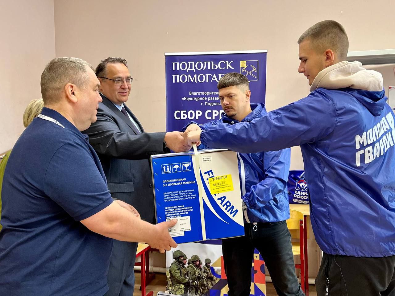 Председатель Совета депутатов Городского округа Подольск Алексей Никулин вместе с первым заместителем председателя, руководителем фракции «Единая Россия» в Городском округе Подольск Любовью Ушаневой и депутатом Совета депутатов Юрием Алексеевым передали распошивальную машинку в волонтёрский центр Городского округа Подольск.