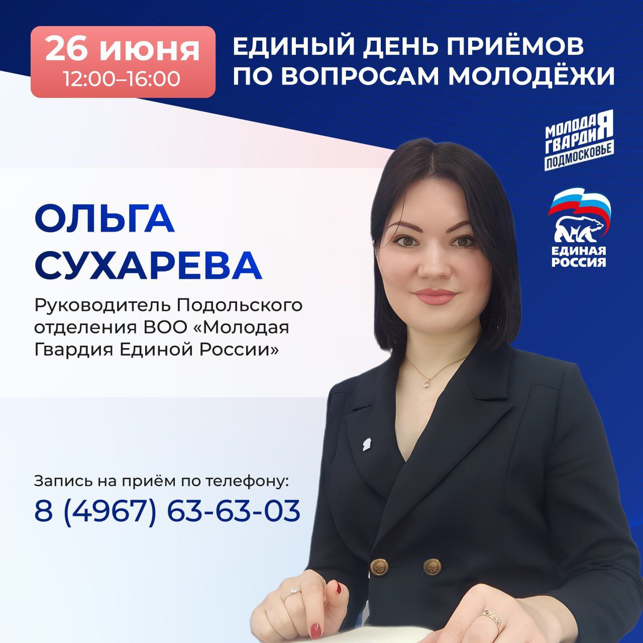 Приём проведёт Ольга Сухарева — Руководитель Подольского отделения ВОО «Молодая Гвардия Единой России».