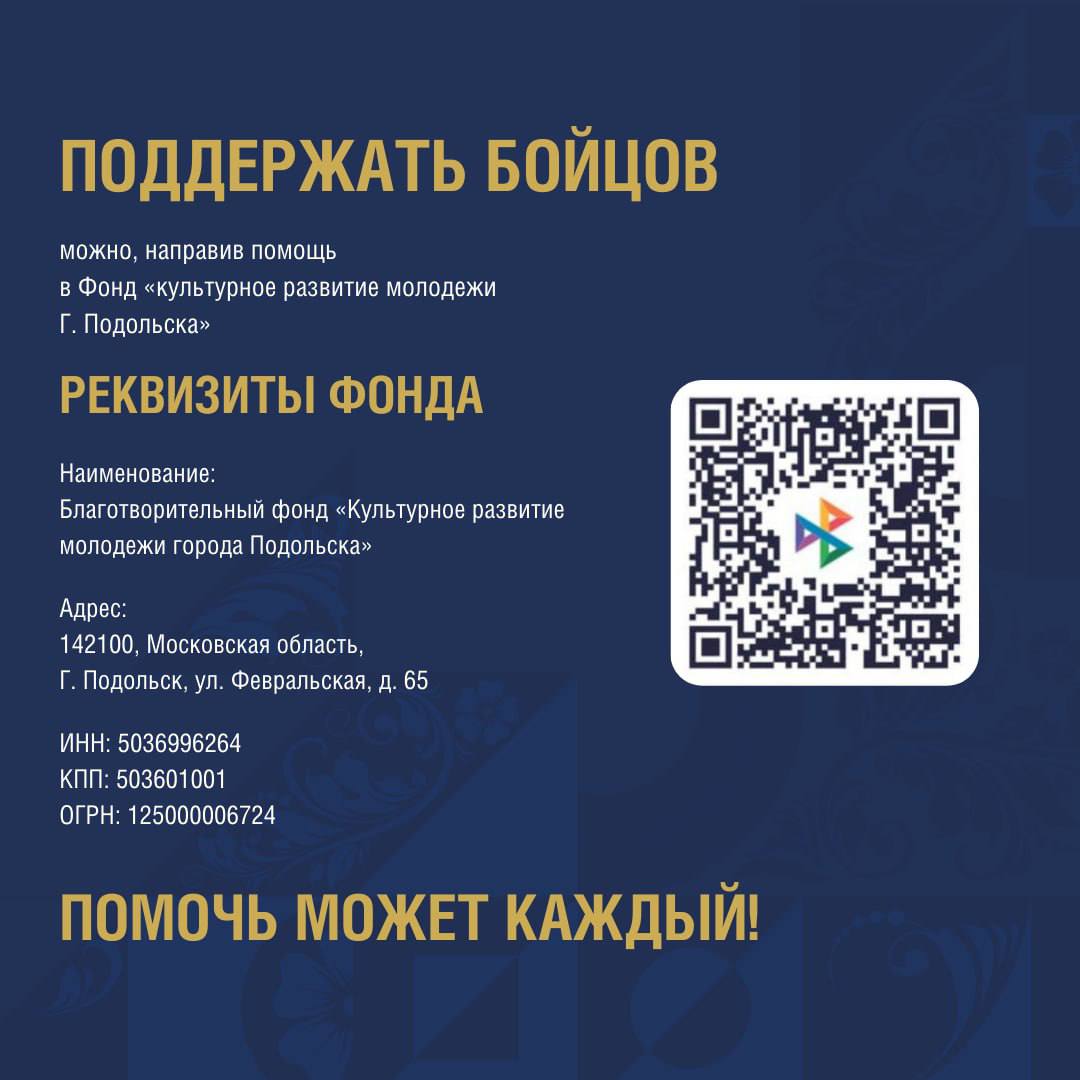 Также можно оказать финансовую помощь через  благотворительный фонд «Культурное развитие молодежи г. Подольска».