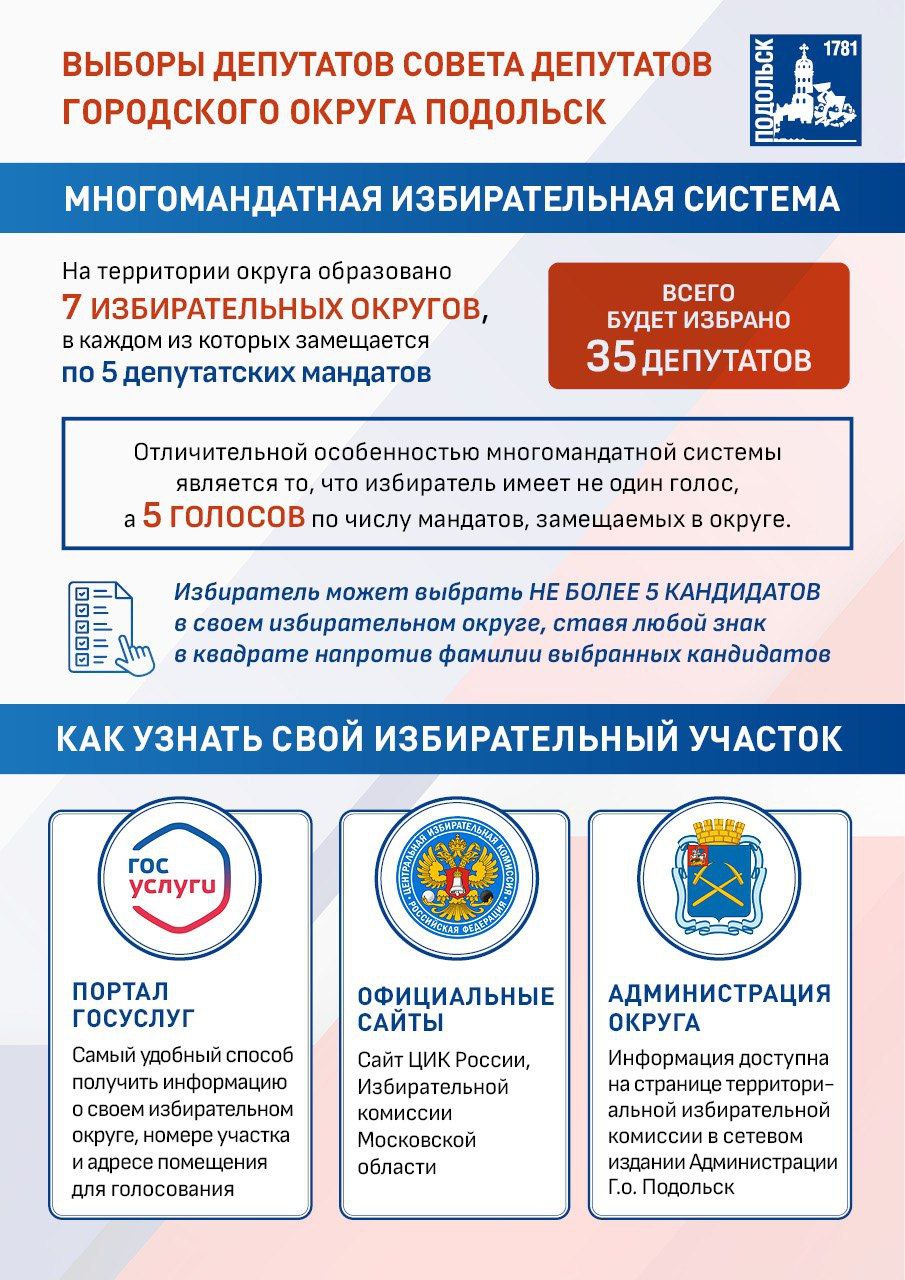 У каждого избирателя будет возможность поддержать до пяти кандидатов из числа выдвинутых в каждом избирательном округе. Все избирательные участки подготовлены и будут работать с 08:00 до 20:00. Адрес своего участка можно уточнить на «Госуслугах», сайтах ЦИК России и Мособлизбиркома, а также на странице ТИК Подольска.