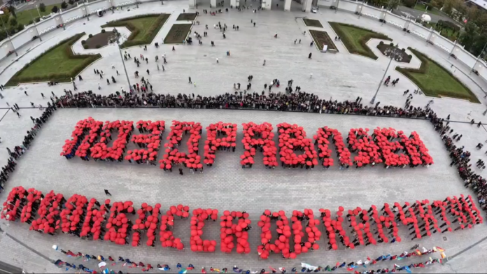 Все вместе они выстроились в живую надпись «Поздравляем от Камчатки до Донбасса», продемонстрировав единство и поддержку со всех уголков страны.