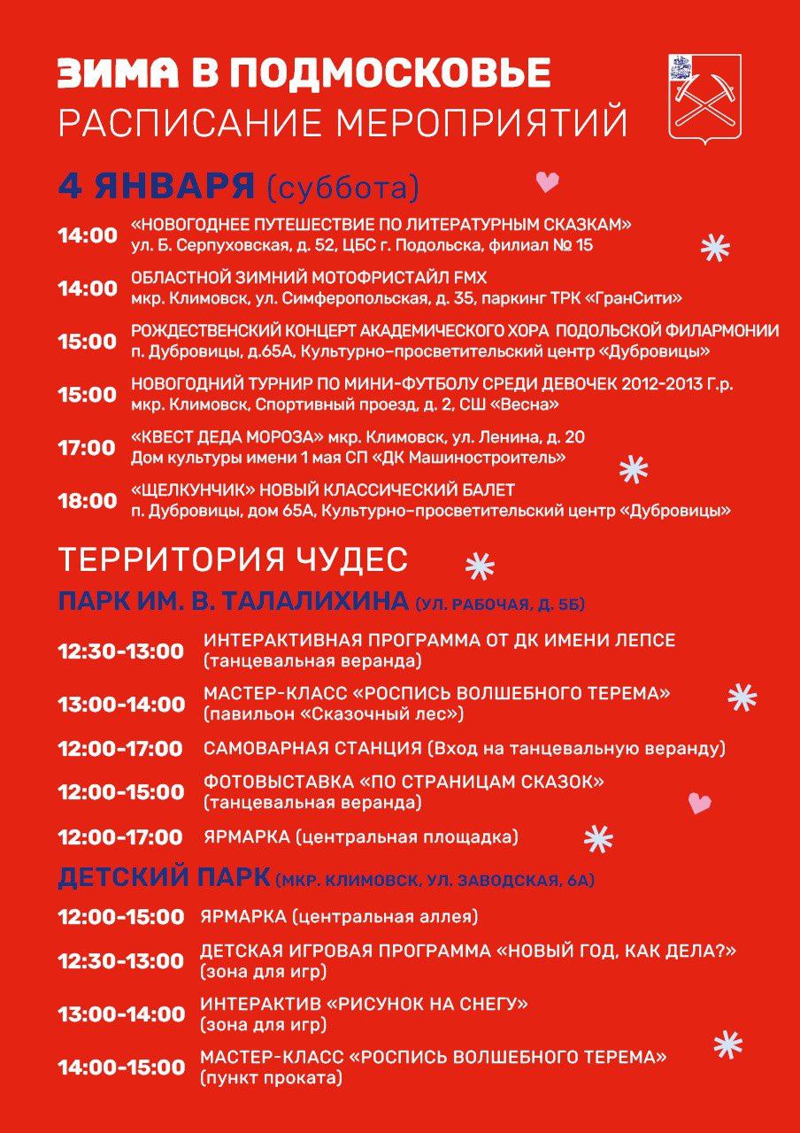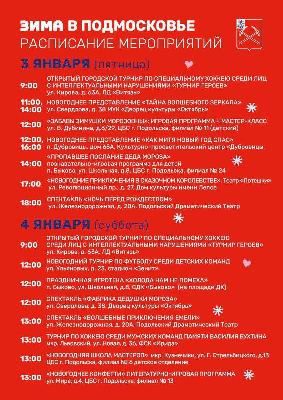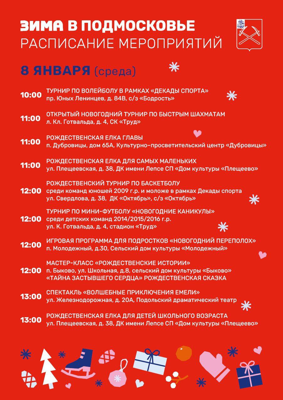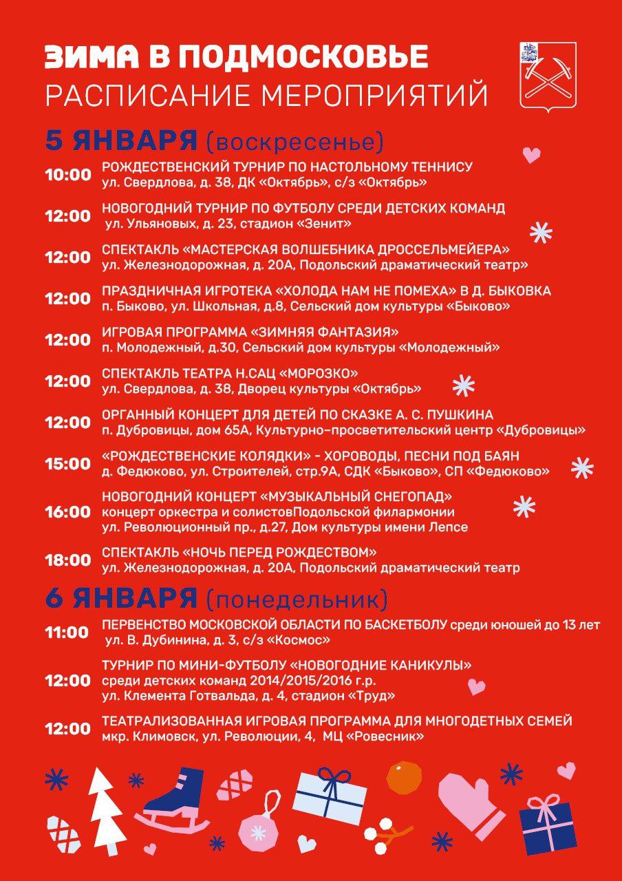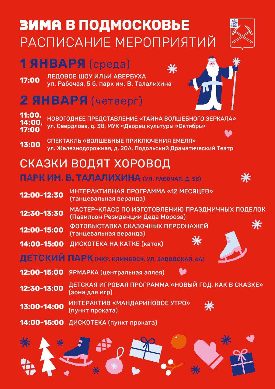 Игровые программы, спектакли, концерты, ярмарки, спортивные турниры будут идти в самых разных уголках Подольска до восьмого января. Открывайте афишу и выбирайте!