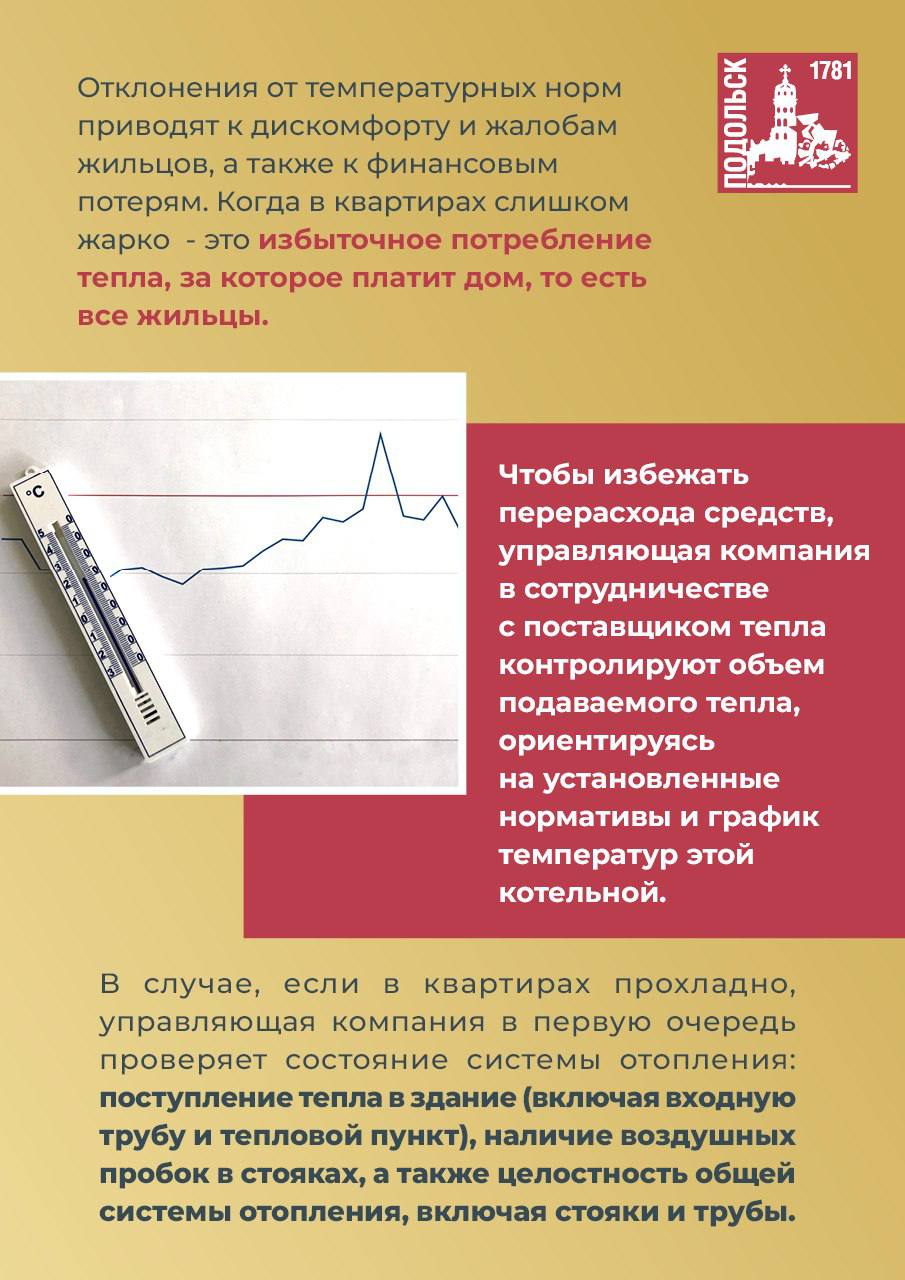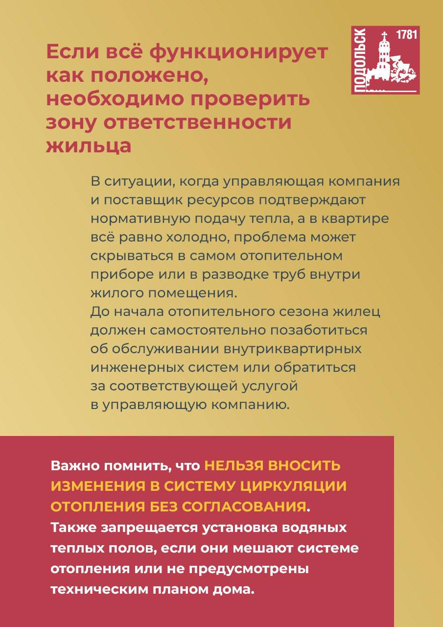 По вопросам подачи тепла или за помощью жители могут обратиться единую диспетчерскую дежурную службу по телефону: 8 (495) 663-99-99, в диспетчерскую управляющей организации «УК Подольск»: 8 (4967) 50-00-50.