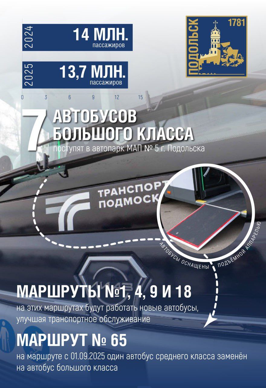 В ближайшее время автопарк МАП № 5 г. Подольска пополнят семь автобусов большого класса. Они выйдут на маршруты № 1, 4, 9 и 18, где особенно заметен рост пассажиропотока. А с 1 сентября на маршруте № 65 заменили автобус среднего класса на большой. Новый транспорт просторный, удобный и адаптирован для маломобильных пассажиров — всё ради того, чтобы поездки были комфортнее и доступнее.