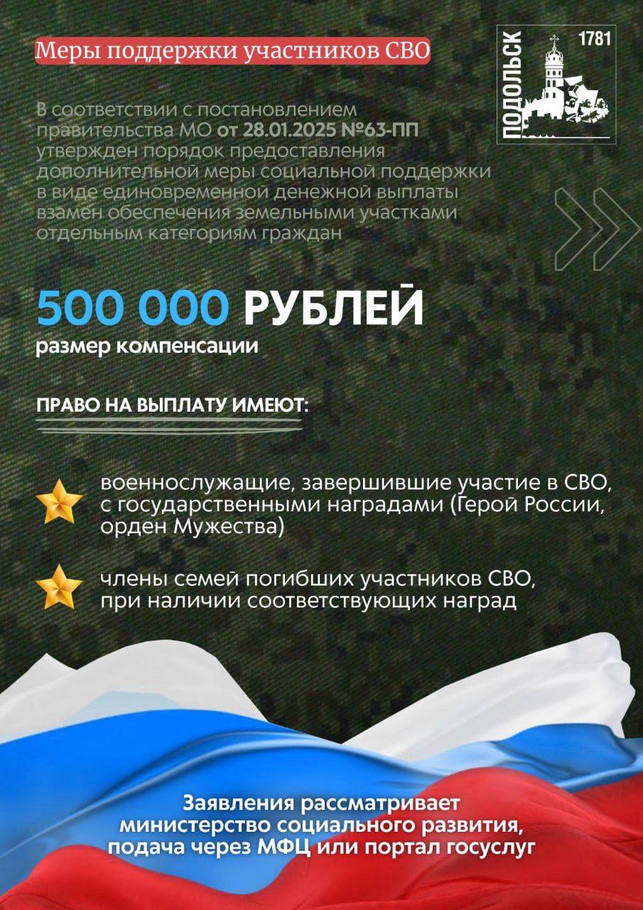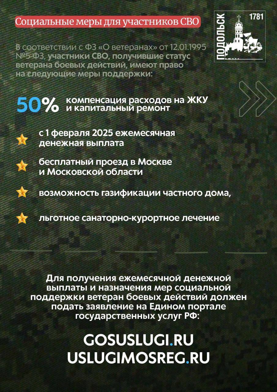 Сегодня участникам спецоперации из нашего округа доступны 75 мер социальной поддержки, 32 из которых – региональные. Это ежемесячные выплаты, скидки на оплату жилья и капитального ремонта, бесплатный проезд на общественном транспорте и многое другое. Для ветеранов боевых действий, удостоенных государственных наград, предусмотрена единовременная выплата взамен земельного участка. Уже 9 подольчан получили такую компенсацию, ещё 8 заявок находятся на рассмотрении.