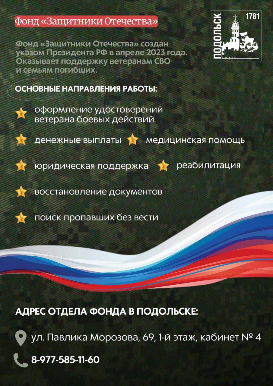 На улице Павлика Морозова, 69, работает подольское отделение фонда «Защитники Отечества». Под его крылом – все участники СВО, семьи павших бойцов. Также с февраля на территории округа действует ассоциация ветеранов СВО Московской области. За поддержкой можно обратиться и в центр помощи на улице Чистова, 11/8. Тел. для связи: 8 (4967) 57-77-71,  8 (964) 724-12-65.