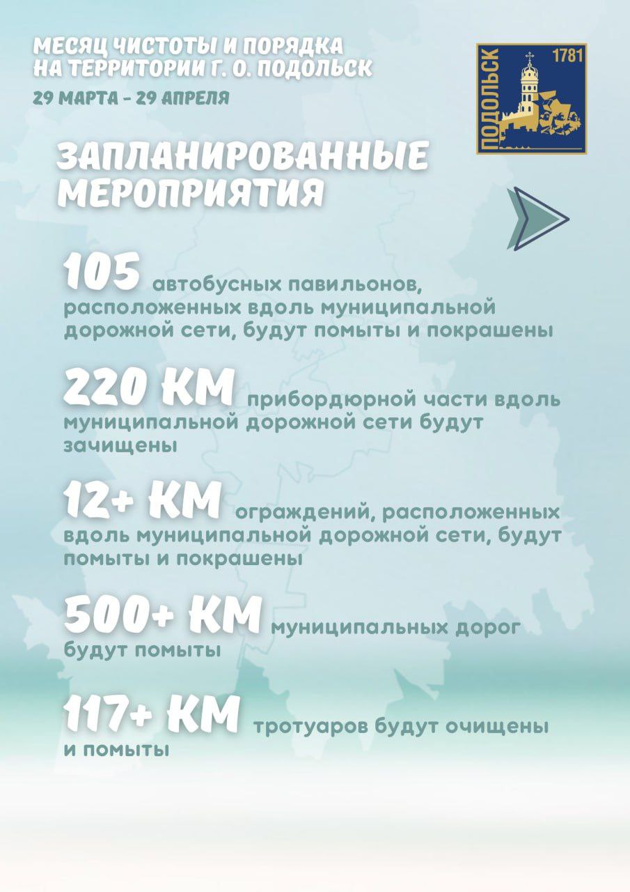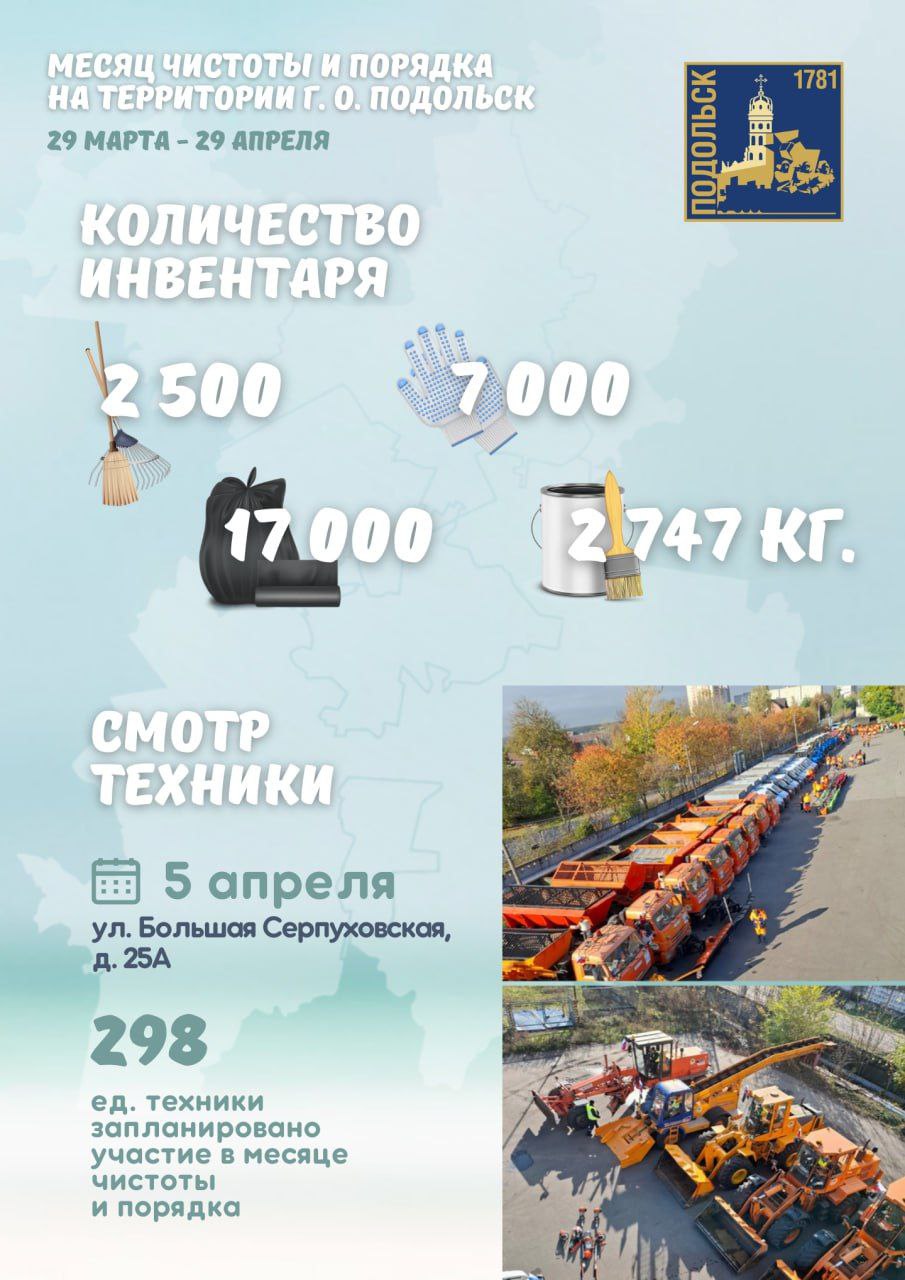 Глава городского округа Подольск Григорий Артамонов отметил: «Каждое место работы будет сопровождать машина для вывоза собранного мусора. Кроме того, совместно с управляющими организациями проведем работу с жителями многоквартирных домов. Если они захотят выйти на свои придомовые территории, поддержим их и организуем необходимое оборудование для наведения порядка.