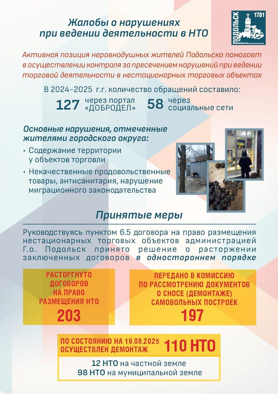 На сегодняшний день расторгнуто 203 договора на размещение НТО. Такие объекты признаются самовольно установленными и подлежат сносу. Продолжается работа в этом направлении.