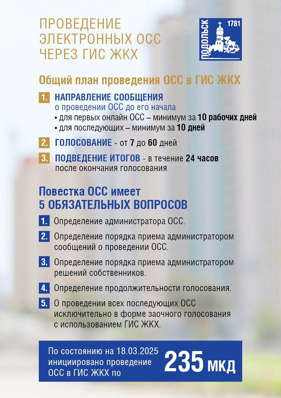 «Совместно с активными жителями и старшими по домам мы уже инициировали проведение электронного ОСС в 235 многоквартирных домах. На этой неделе в рамках форума «Управдом» уделим теме особое внимание. Электронные собрания — это не просто альтернатива бумажным бюллетеням, а шаг в будущее, где главные принципы — честность, прозрачность и реальное отражение мнения большинства», — отметил глава городского округа Подольск Григорий Артамонов.