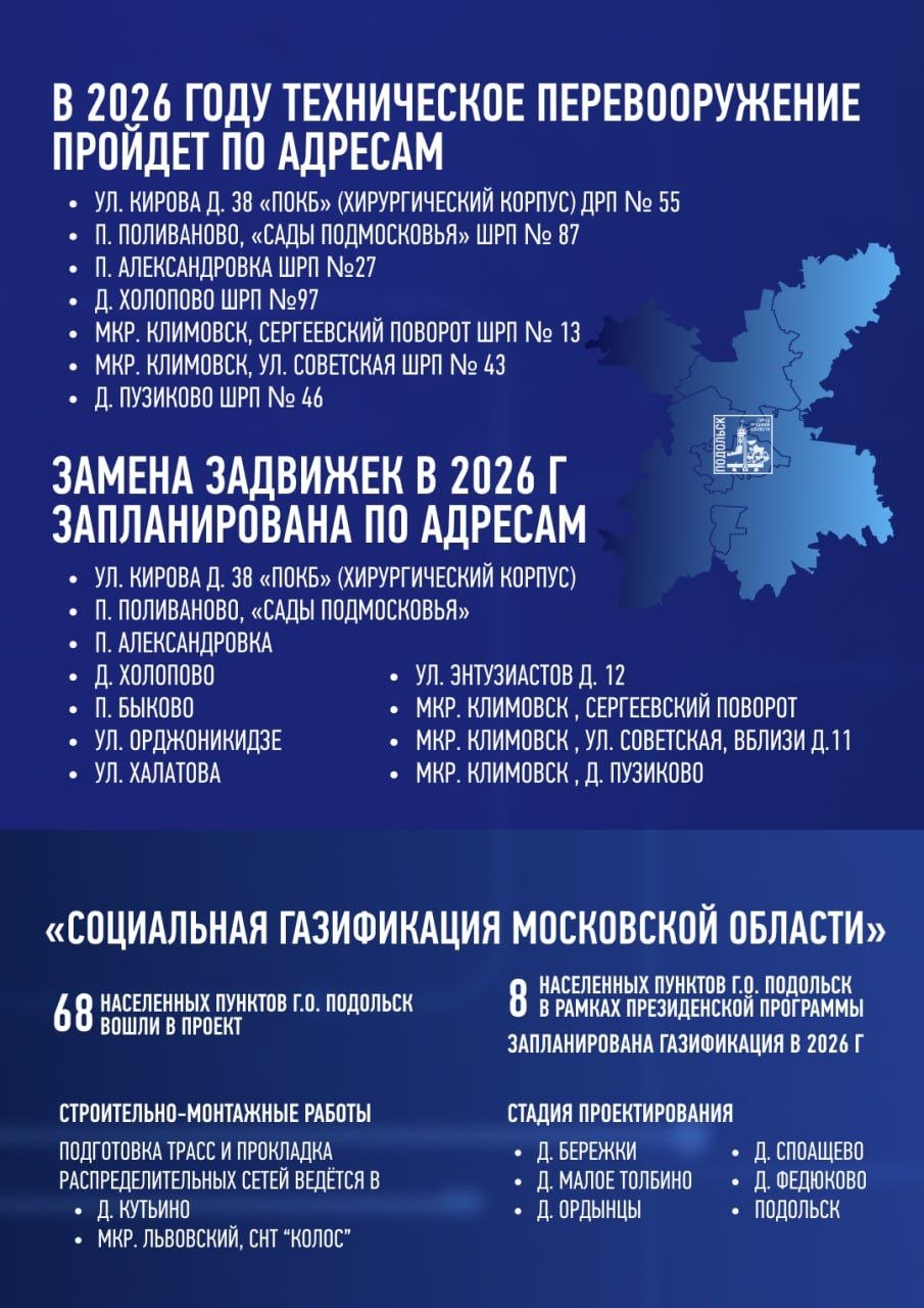 Отдельно отметим, что 68 населенных пунктов городского округа вошли в проект «Социальная газификация Московской области». В этом году работы по президентской программе пройдут в 8 населенных пунктах.
