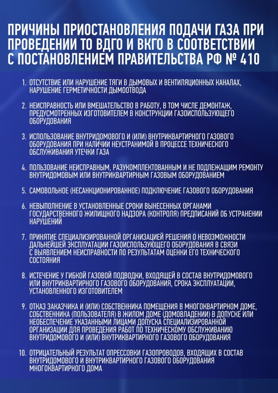 Безопасность зависит не только от работы служб, но и от ответственности каждого жителя. Техническое обслуживание внутридомового и внутриквартирного газового оборудования должно проводиться только специализированной организацией. Подача газа может быть временно приостановлена, если обнаружены утечка, неисправность оборудования, проблемы с вентиляцией или дымоходом, самовольное подключение, а также после недопуска специалистов для проведения проверки.