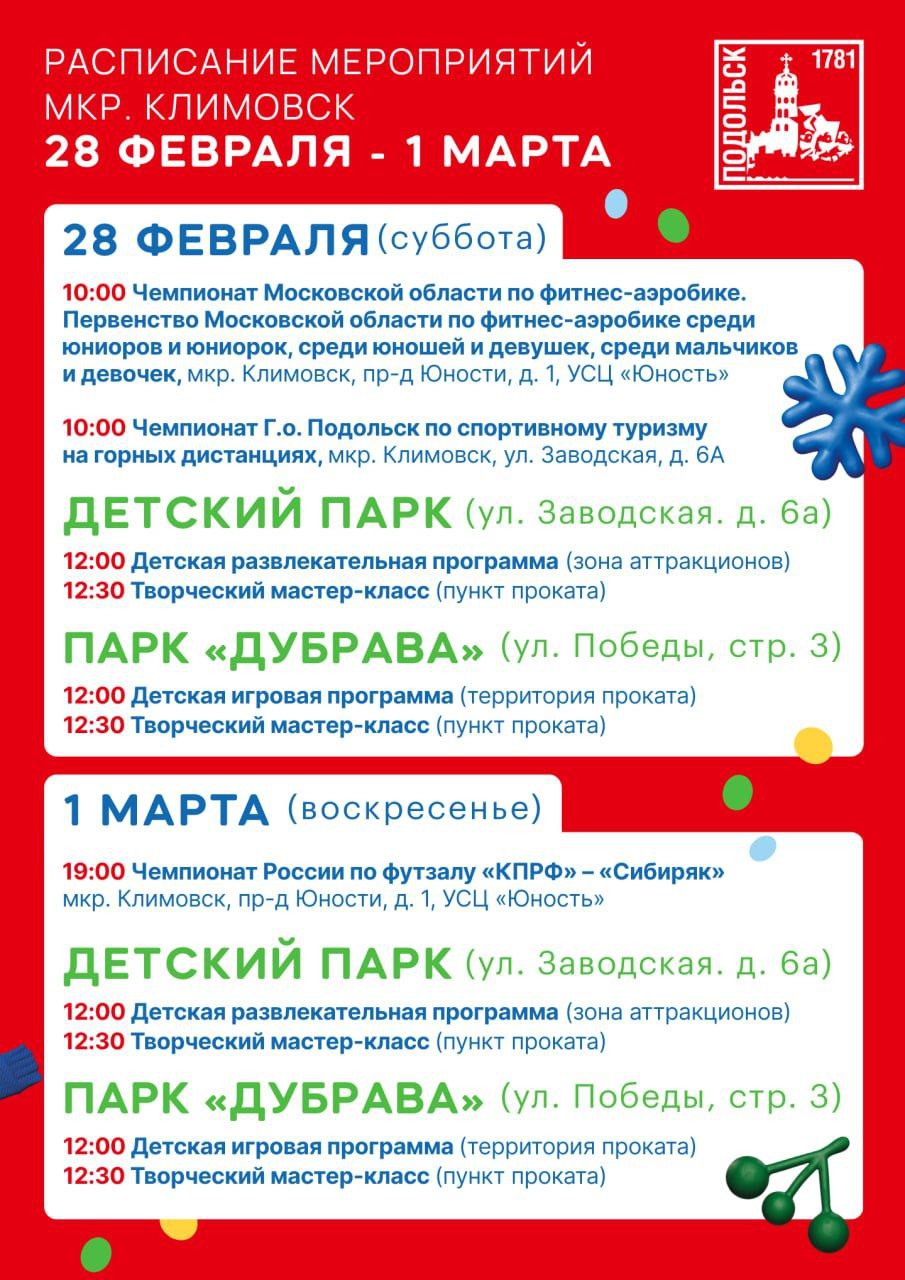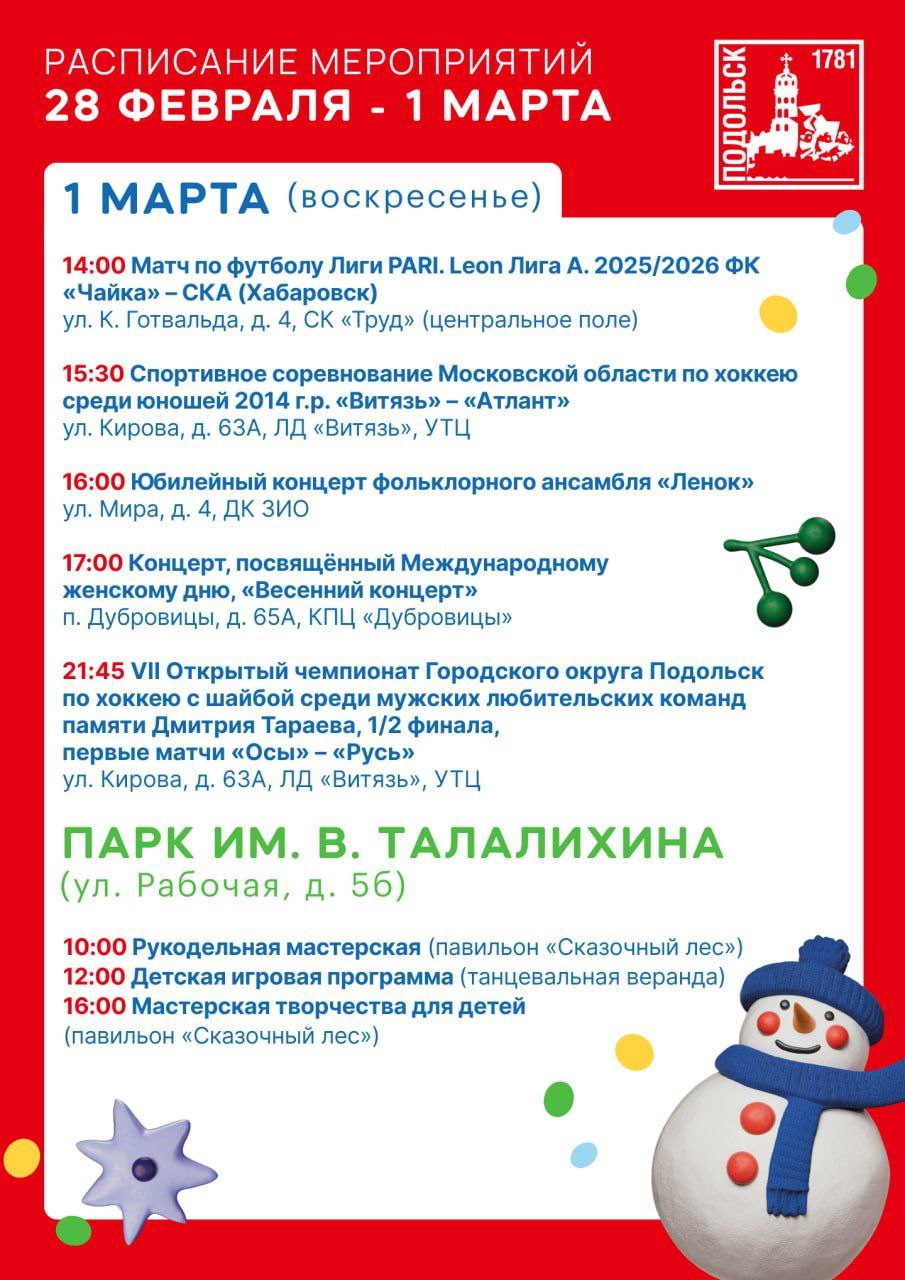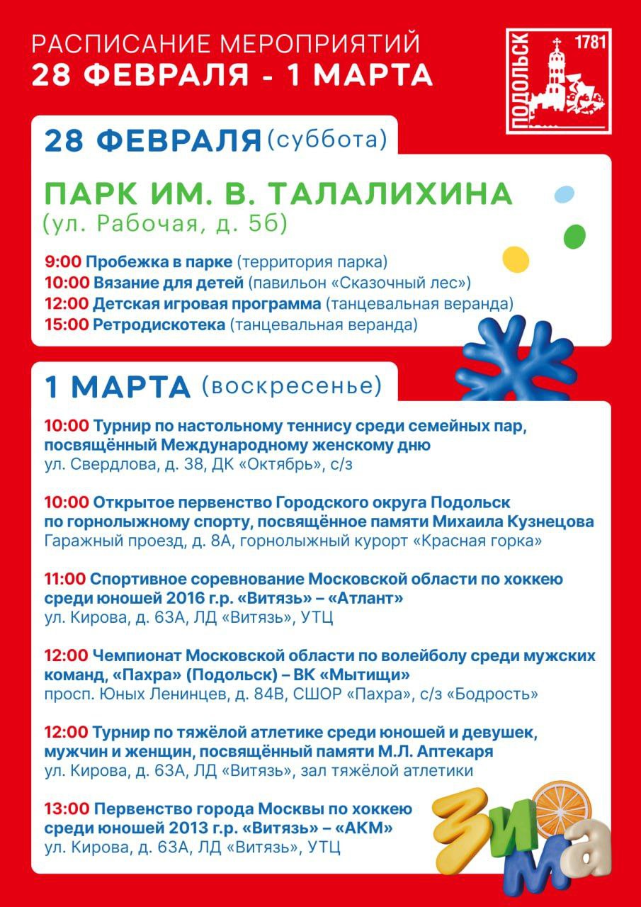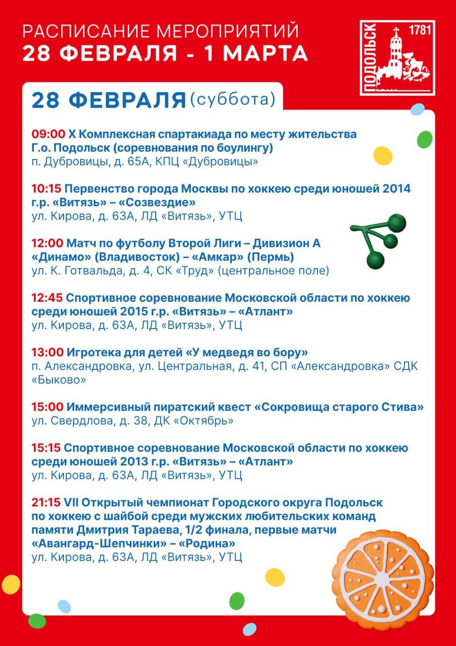 Для любителей спорта тоже много интересного: продолжается серия соревнований по хоккею, футболу, лыжным гонкам и волейболу. Болельщиков ждет напряженная борьба, яркие эмоции и новые победы. А 1 марта состоится турнир по тяжёлой атлетике, посвящённый памяти Михаила Лазаревича Аптекаря — событие, которое объединит сильнейших спортсменов Подольска и всех ценителей этого вида спорта.