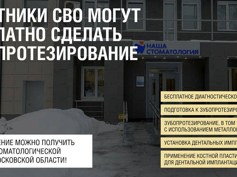 Медицина и экология Те, кто принимал или принимает участие в СВО и проживает в Московской области, могут стать участниками программы губернатора Московской области Андрея Воробьева и сделать зубопротезирование бесплатно.