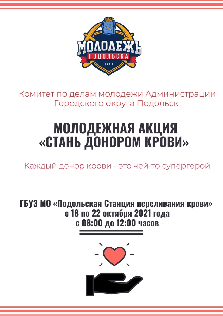 Приглашаем всех желающих (18+) принять участие в традиционной молодёжной акции «Стань донором крови» в период с 18 по 22 октября 2021 г. с 08:00 до 12:00 ч.в ГБУЗ МО «Подольская станция переливания крови» (ул.Кирова д.9).