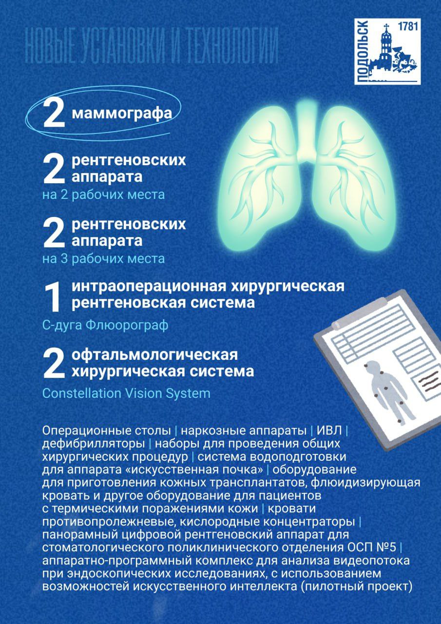 Большое внимание уделяется обновлению оборудования по программе губернатора Подмосковья Андрея Воробьева. В больнице установлены современные маммографы, рентген- и флюорографические комплексы, оборудование для реанимации, диализа и ожогового центра. Отдельно отметим пилотный проект с применением искусственного интеллекта при эндоскопических исследованиях. Ведется и масштабное обновление инфраструктуры. Завершены: реконструкция реанимации хирургического корпуса на улице Кирова, 38, текущий ремонт ОСП № 7. С нуля построили шахту лифта к стационарному корпусу ОСП № 2. Сейчас идёт настройка оборудования.