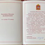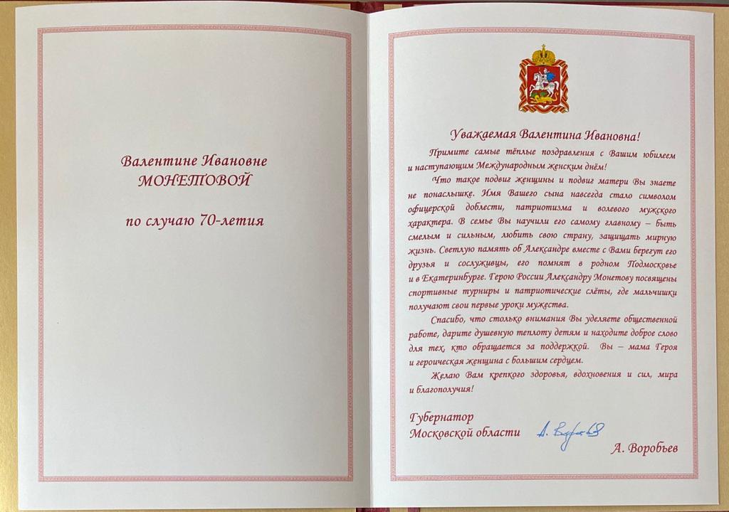 Виктор Чуб поздравил Валентину Ивановну с юбилеем, а затем зачитал поздравления и вручил награды от Губернатора Московской области Андрея Воробьева и главы Городского округа Подольск Николая Пестова. В памятном адресе губернатора есть такие строки: «Что такое подвиг женщины и подвиг матери Вы знаете не понаслышке. Имя Вашего сына навсегда стало символом офицерской доблести, патриотизма и волевого мужского характера. В семье Вы научили его самому главному – быть смелым и сильным, любить свою страну, защищать мирную жизнь. Светлую память об Александре вместе с Вами берегут его друзья и сослуживцы, его помнят в родном Подмосковье и Екатеринбурге. Герою России Александру Монетову посвящены спортивные турниры и патриотические слеты, где мальчишки получают свои первые уроки мужества…».