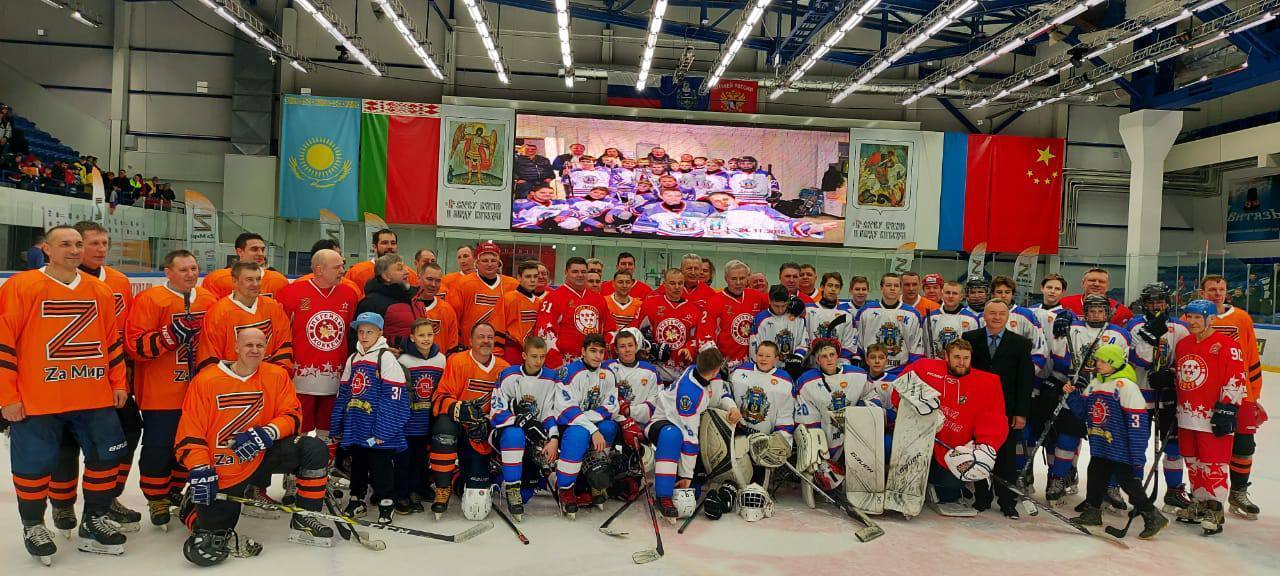 Благотворительный хоккейный матч «ZaМир» с целью поддержки российских военных, участвующих в специальной операции на территории Украины, и сбора денежных средств, которые пойдут на нужды жителей Донбасса, прошел в Чехове на арене ледового дворца «Витязь».