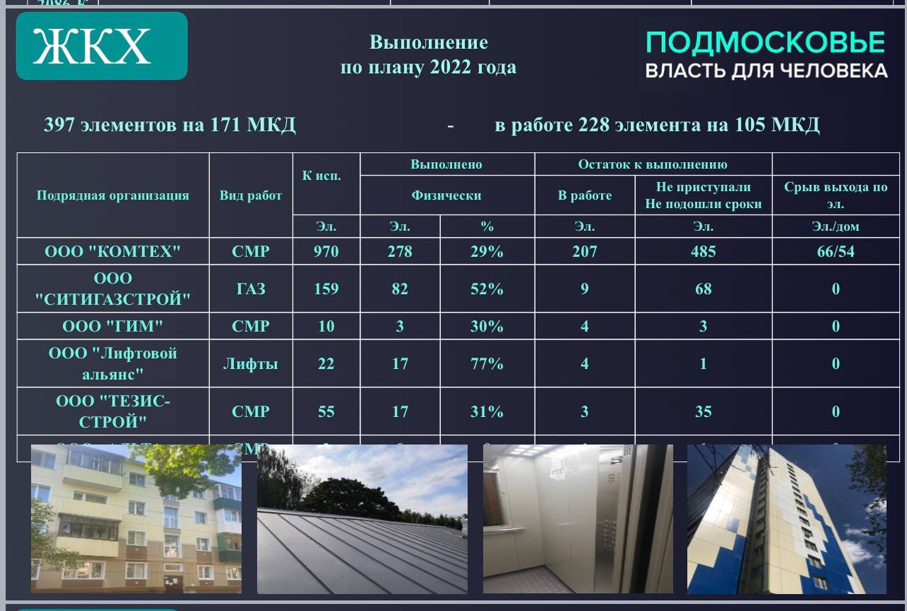 Держат в администрации на контроле работу управляющих организаций – до 1 сентября они должны завершить техническое обслуживание и ремонт инженерных систем в 1978 МКД округа. Муниципальные УК в лидерах по подготовке – 11 организаций находятся в зелёной зоне. Беспокойство вызывают частные компании, 12 из них, такие, как «Спецкоммунпроект», «Управдом» «Импульс», «Наш дом», «Пересвет Подольск» и другие, ещё даже не приступили к работам. В лидерах антирейтинга ООО «Комтех», на обслуживании которого находится 71 многоквартирный дом. Впереди чуть больше месяца, но жертвовать качеством ради скорости непозволительно. К нарушителям будут применять самые суровые меры, вплоть до обращений в прокуратуру.