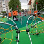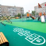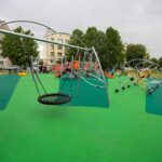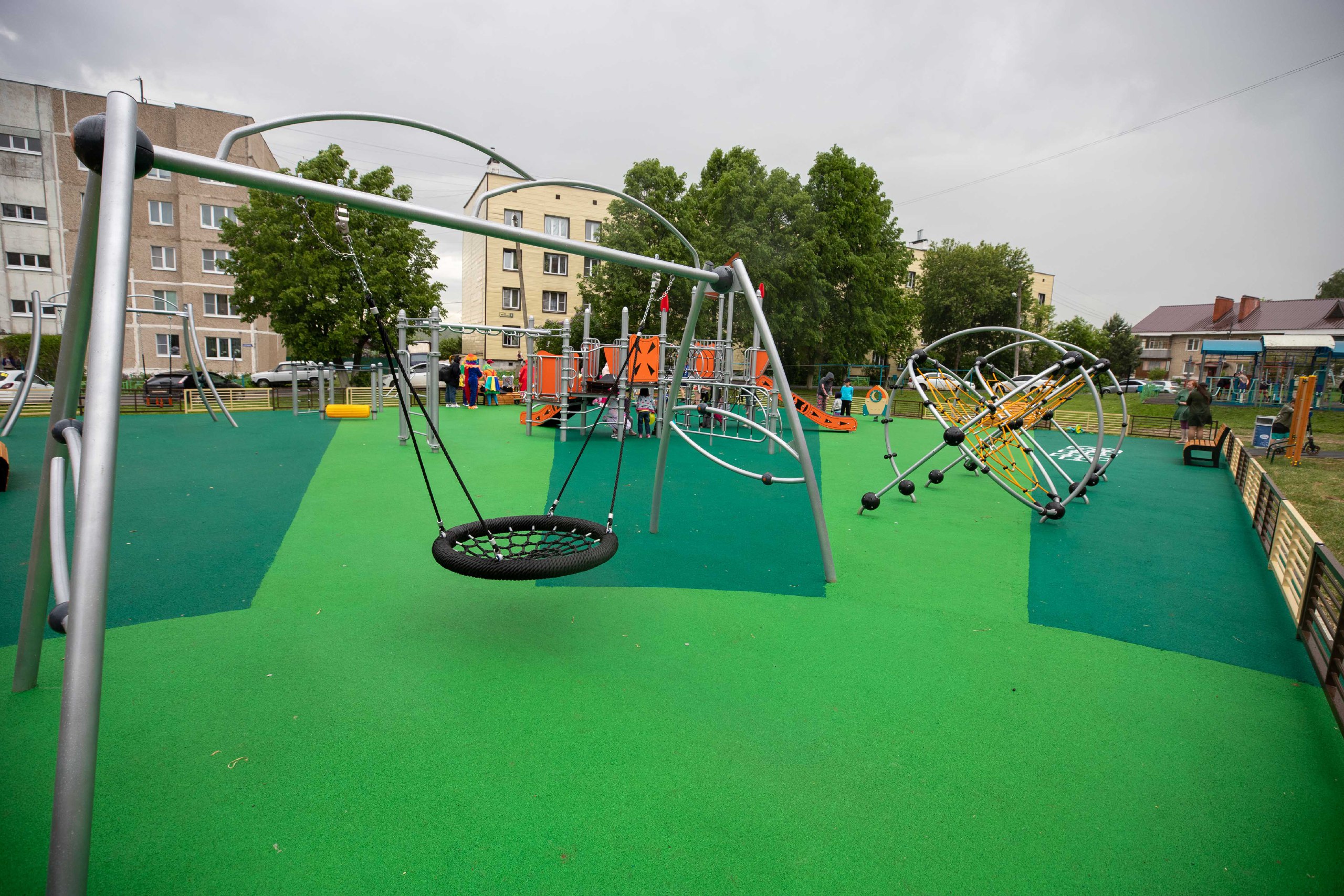 Все элементы выполнены из прочного металла с соблюдением требований безопасности, уложено упругое нетравматичное резиновое покрытие. Площадь детской площадки — около 300 квадратных метров.