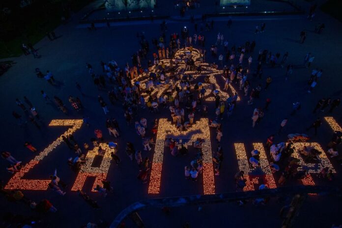 Из 12 тысяч зажженных свечей подольчане выложили фигуру советского солдата и надпись «Zа Мир». Затем минутой молчания почтили память всех, кто не вернулся с войны, – солдат и офицеров, известных и безымянных героев, наших дедов и прадедов.