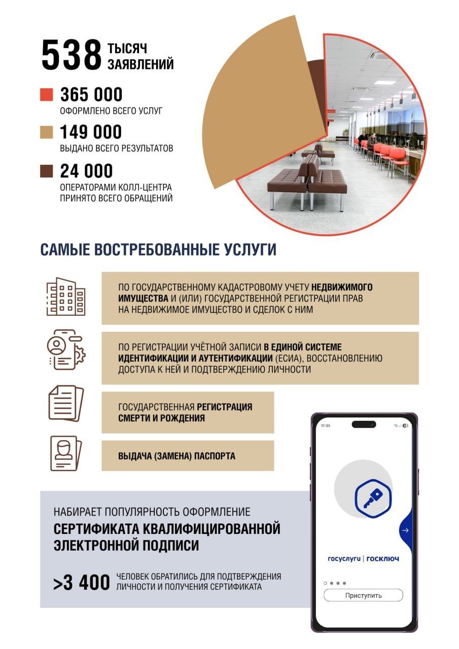 Только за 2025 год общее число обращений превысило 500 тысяч. Из них более 365 тысяч заявлений было подано при личном визите: оформление паспортов, регистрация недвижимости, получение СНИЛС, ИНН и многое другое.
