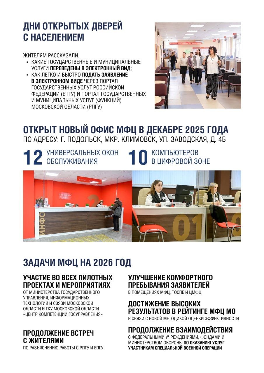 Система многофункциональных центров Подольска продолжает устойчиво развиваться, обеспечивая доступность и качество государственных и муниципальных услуг для жителей округа.