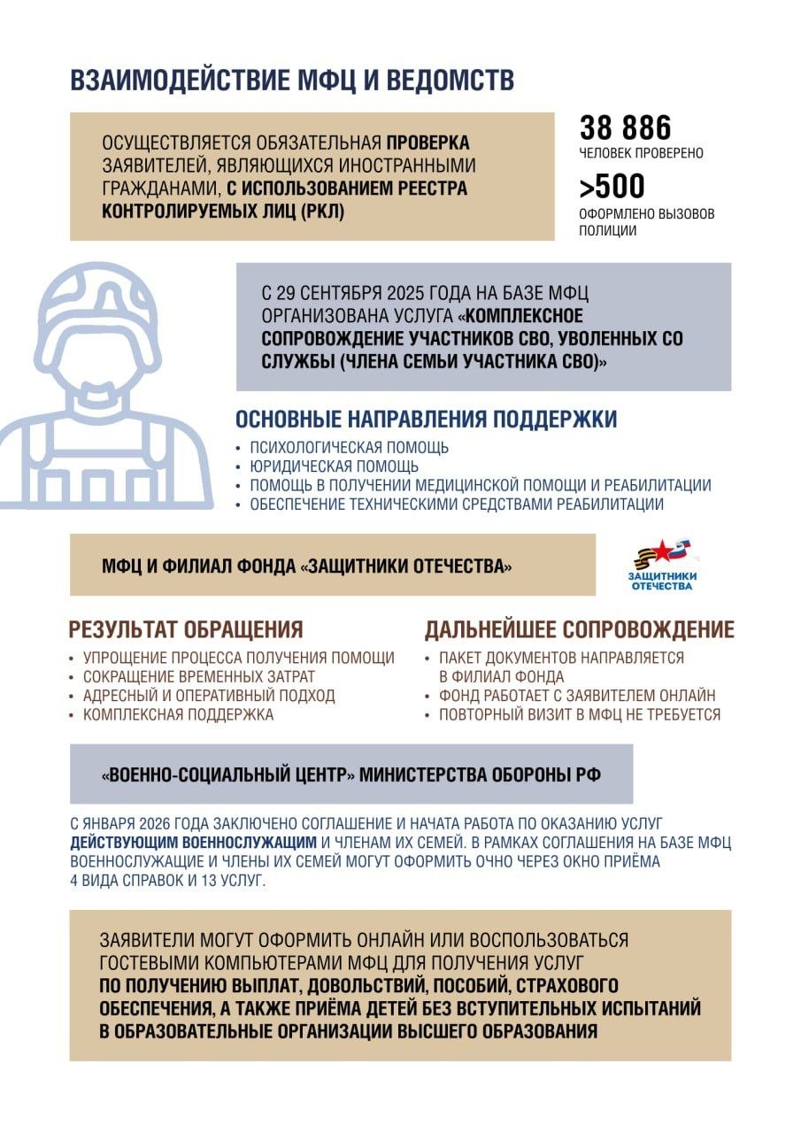 Особое внимание уделяется участникам специальной военной операции и их семьям. С 2025 года на базе МФЦ оказывается комплексная поддержка: от юридической и психологической помощи до содействия в трудоустройстве и реабилитации. Уже обработано более 50 обращений. С 2026 года эта работа расширена: теперь в МФЦ можно оформить необходимые справки, получить помощь в назначении выплат и мер социальной поддержки.