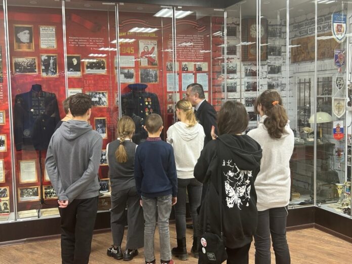Полицейские рассказами ребятам о подвигах сотрудников, служивших в органах внутренних дел — Дмитрие Авдееве, награжденном Орденом Мужества, и герое Российской Федерации Александре Монетове.