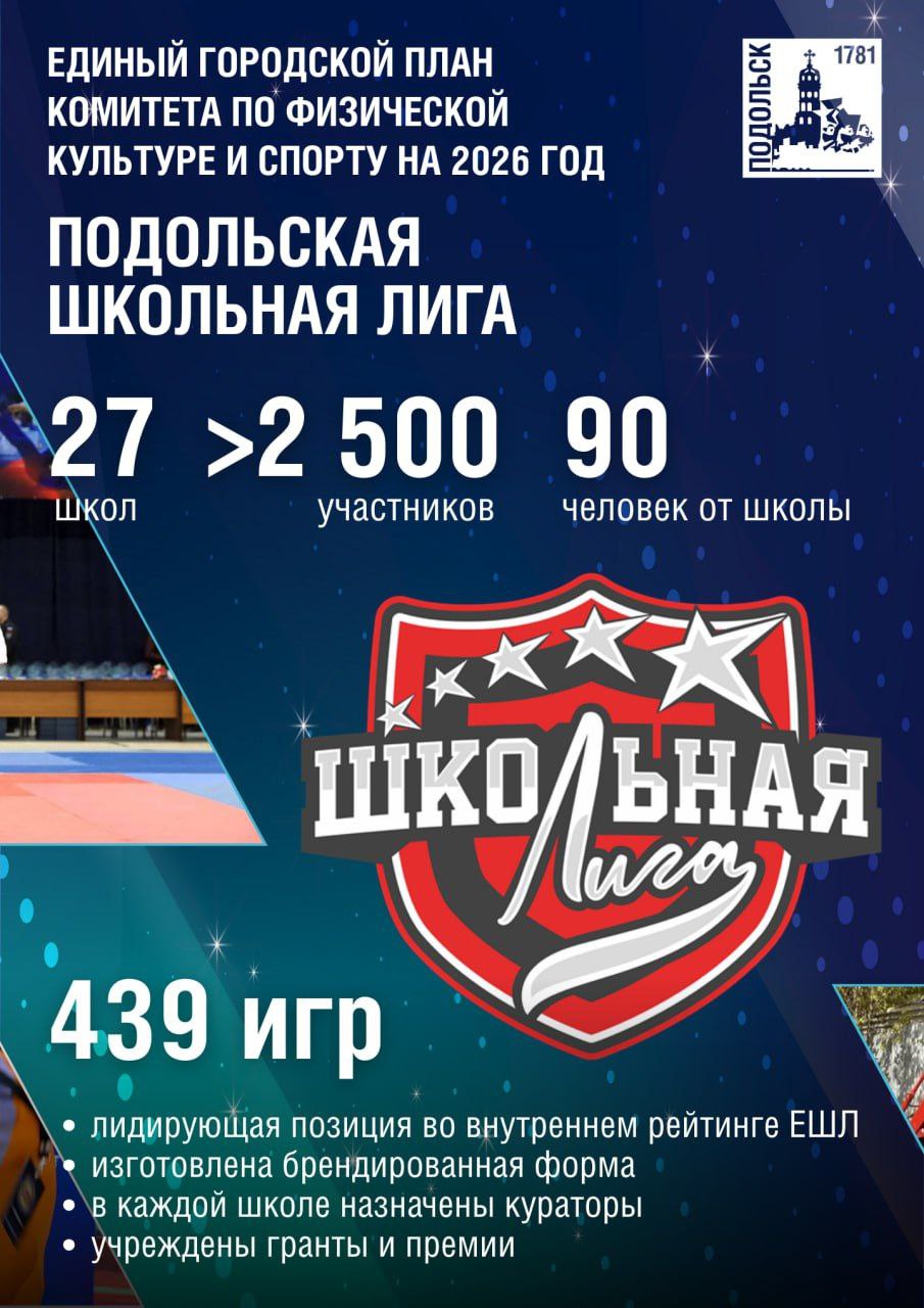 Продолжаем развивать Подольскую школьную лигу — уже сегодня в ней участвуют более 2 500 ребят. В ближайшее время добавим новые дисциплины: самбо, гонки дронов, лазертаг, тэг-регби, а также фиджитал-спорт.