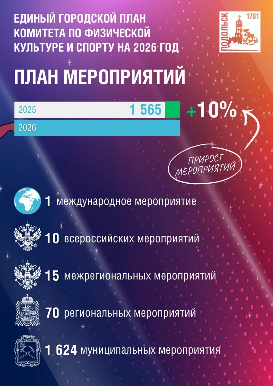 Глава городского округа Подольск Григорий Артамонов после проведения профильного часа в администрации сообщил: «Планируем провести на 10 % больше спортивных мероприятий, чем в 2025-м. В календаре — международные, всероссийские, межрегиональные и региональные соревнования, а главное — более 1 600 муниципальных, которые охватят тысячи жителей всех возрастов.