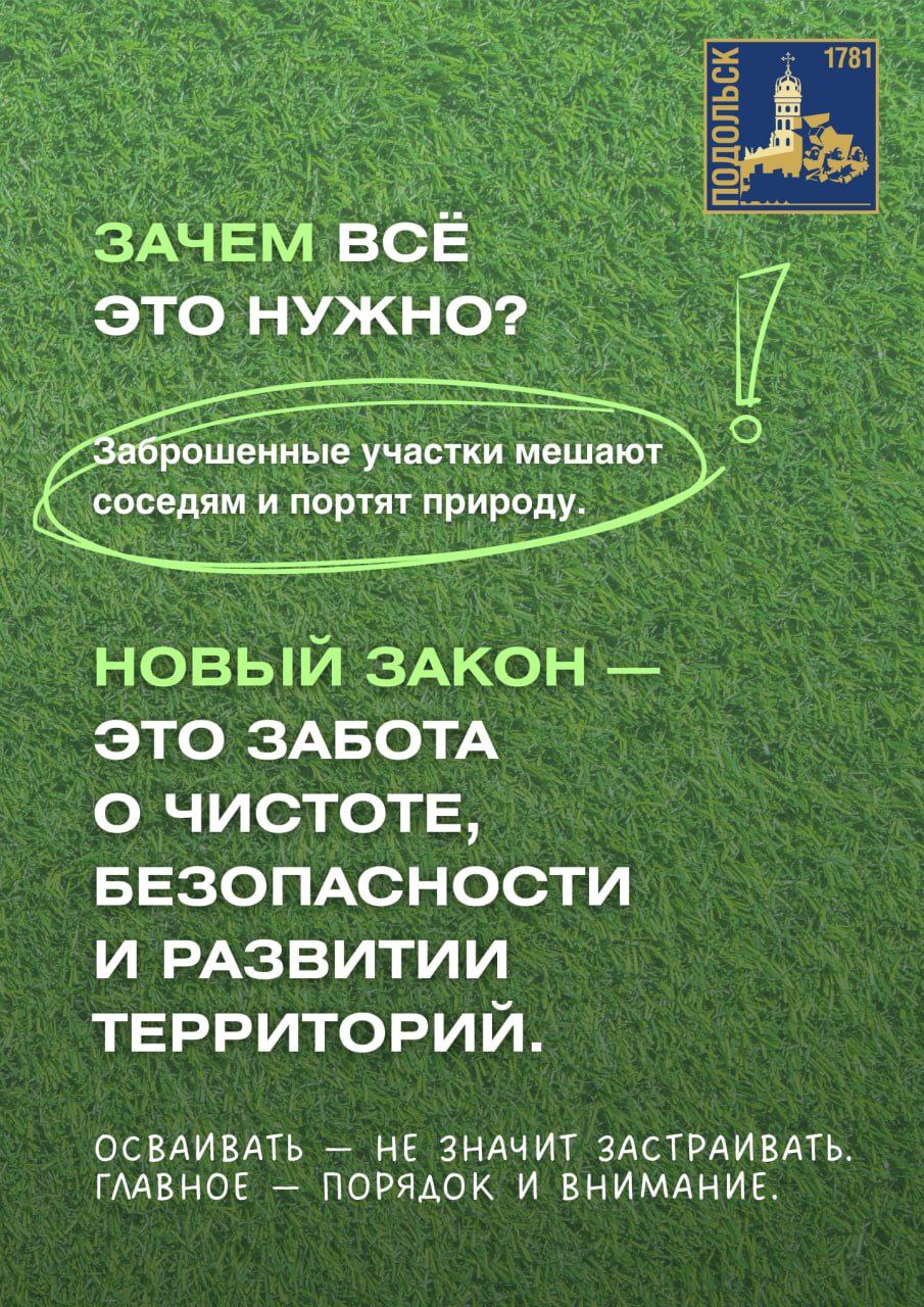 Заросшие, брошенные, захламлённые пространства — это не просто вопрос эстетики. Это ответственность. И, конечно, лицо Подольска. Наша общая обязанность – заботиться о том, чтобы земля не пустовала и не превращалась в заброшенную. Поэтому вместе с Росреестром будем проводить профилактические и контрольные мероприятия. Сначала — предупреждение. Затем — предписание. Если игнорировать — возможна административная ответственность и, в крайнем случае, изъятие.