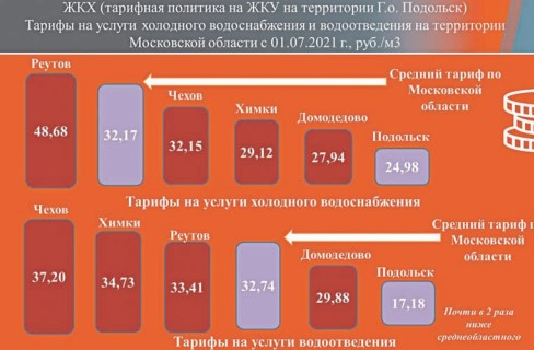 Да, стоимость коммунальных услуг ежегодно индексируется, однако в этом году рост составил всего 1,5%–3,7%, что в два раза ниже уровня инфляции (по итогам 6 месяцев 2021 года она составила 6,5%). Больше того, плата за коммунальные услуги по параметрам «среднего дома», рассчитанная исходя из установленных тарифов и нормативов, с 1 июля этого года в Подольске составляет 6013 рублей, а в среднем по Московской области на 15% больше – 6922 рубля. Один только средневзвешенный тариф на услуги водоотведения в Московской области – 32 рубля 74 копейки за кубометр, то есть почти в 2 раза выше тарифа, действующего на территории Подольска. Холодная вода у нас на 28% дешевле, чем в среднем по региону, горячая – на 50%, а теплоснабжение – почти на 9%.
