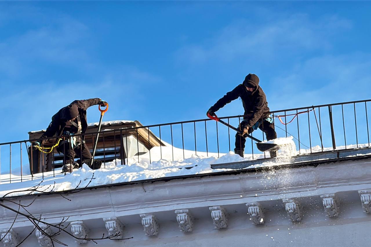 Коммунальные службы и управляющие организации очищают кровли многоквартирных домов от снежных масс, наледи и сосулек. Работы выполняют профессиональные промышленные альпинисты, а на отдельных объектах задействована спецтехника — автовышки.