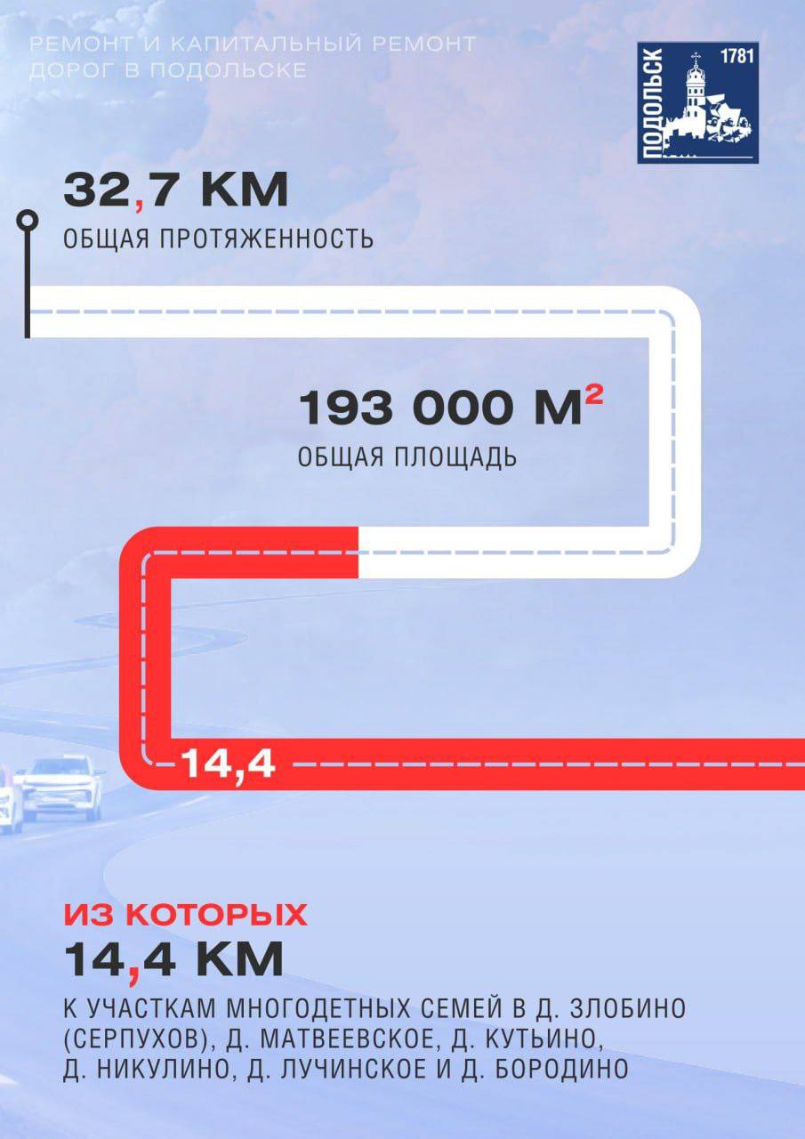 В этом году в городском округе в программу ремонта включены 39 муниципальных дорог общей протяженностью почти 33 километра. Значительная часть — к участкам многодетных семей, отремонтируют более 14 километров дорожного полотна.