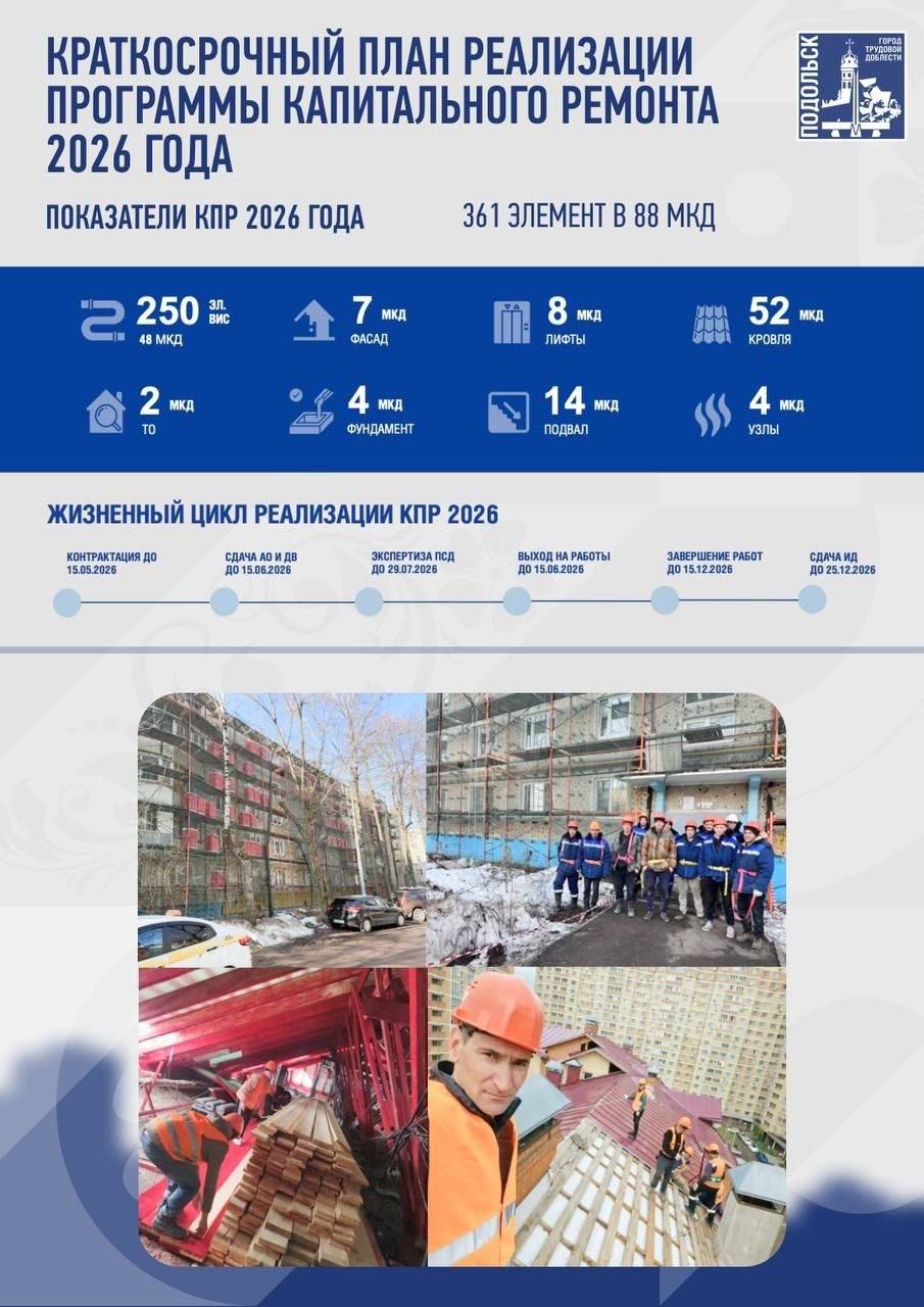 По итогам 2025 года программа капитального ремонта выполнена на 98 %. Отремонтированы фасады в 29 домах, заменены лифты в 9 домах, выполнен ремонт кровель в 83 домах, а также модернизированы инженерные системы в 48 домах. Всего работы прошли в 145 многоквартирных домах. В работе остаются единичные объекты: на улице Литейной и в микрорайоне Климовск.